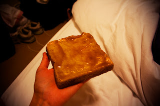 personally, i was really excited for our itinerary today. today we went to ikebukuro, and it was like a smorgusboard of fun. but first, we of course had breakfast. bread with "peanut cream".